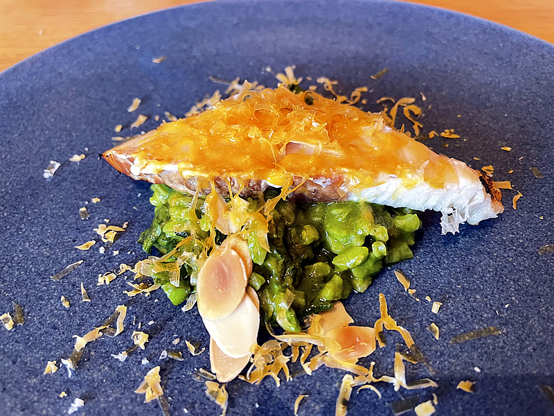 6.「カルナローリ米のリゾット 鰆のアフミカータ 春菊」カルナローリ米というイタリアの品種のお米は、なんと佐川町産とか!それに春菊を合わせてリゾットにしています。上には鰆(さわら)の燻製とミモレットチーズ、アーモンドのローストなど、様々な食感と味わいが広がります。鰆の燻製は素晴らしい香りで、食欲がそそられました。