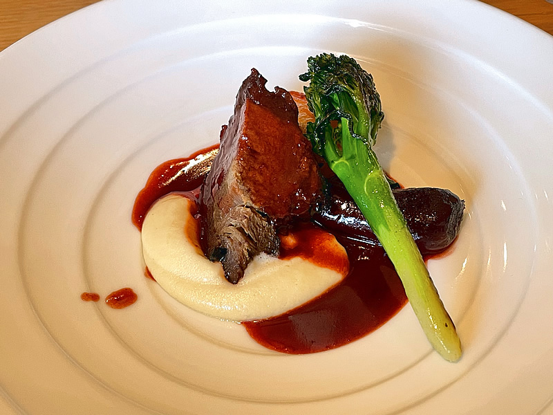 7.「猪もも肉のブラザート 根セロリのピュレ」メインは煮込み料理です。大豊町の猪鹿工房おおとよから、猪のもも肉を赤ワインとトマトで煮込み、ビーツ(赤カブ)で色をつけています。下に根セロリ、上にはスティックブロッコリー。白に紅のソースが映えますね。猪は柔らかくほろほろと崩れて、もう大満足でした。