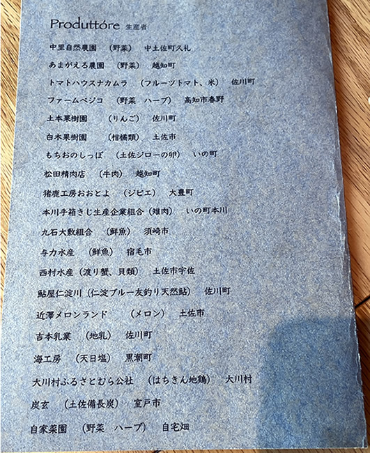 メニュー表の裏側には「生産者」として、室戸から宿毛まで幅広く20ほどの事業者のお名前がありました。丁寧にご紹介して、手を取り合って未来に進んで行こうという、ダゼロの的場さんの姿勢には心を打たれました。