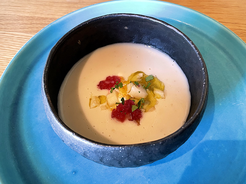 1.「里芋と新生姜 自家製リコッタチーズ」。温かいスープは中土佐町久礼の中里自然農園の里芋と新生姜に、佐川町の吉本乳業の自家製リコッタチーズがよく合って、とろっとした味わい。生の菊芋とピクルスがアクセントになり、垂らしたオリーブオイルが複雑な奥深い味わいを作り出しています。