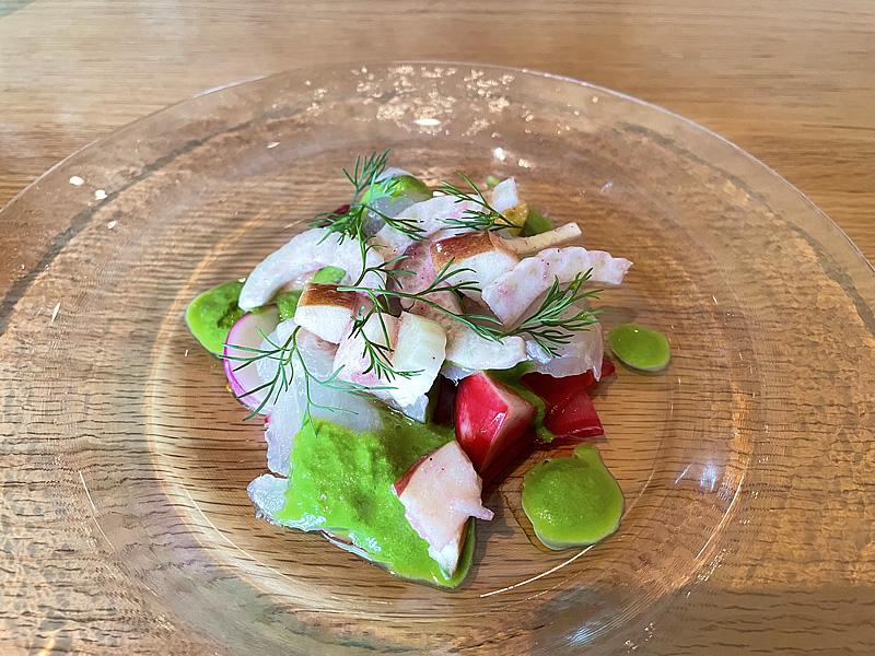 2.「熟成クエ 根菜と林檎のサラダ」。クエは須崎でまれに揚がる3キロほどの大きなものを2週間寝かせて熟成させたもの。柔らかく、身にほのかな甘みを感じました。初めセロリかと思った弓状の野菜は「フェンネルです」と教えて頂きました。道理でセロリ嫌いの私も美味しいと思ったわけです。綺麗な緑色のソースは、カブの葉が入っているそうで、なんだか見ているだけで豊かになる感じです。