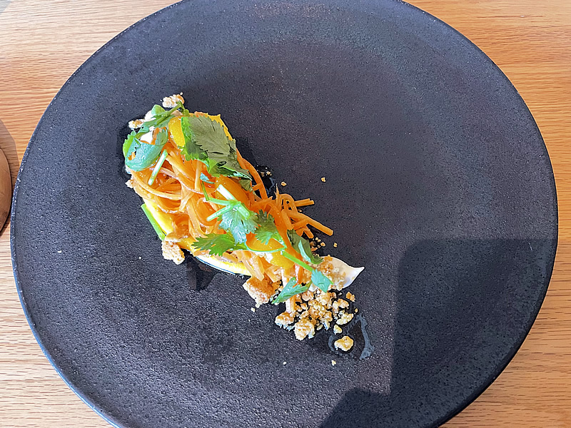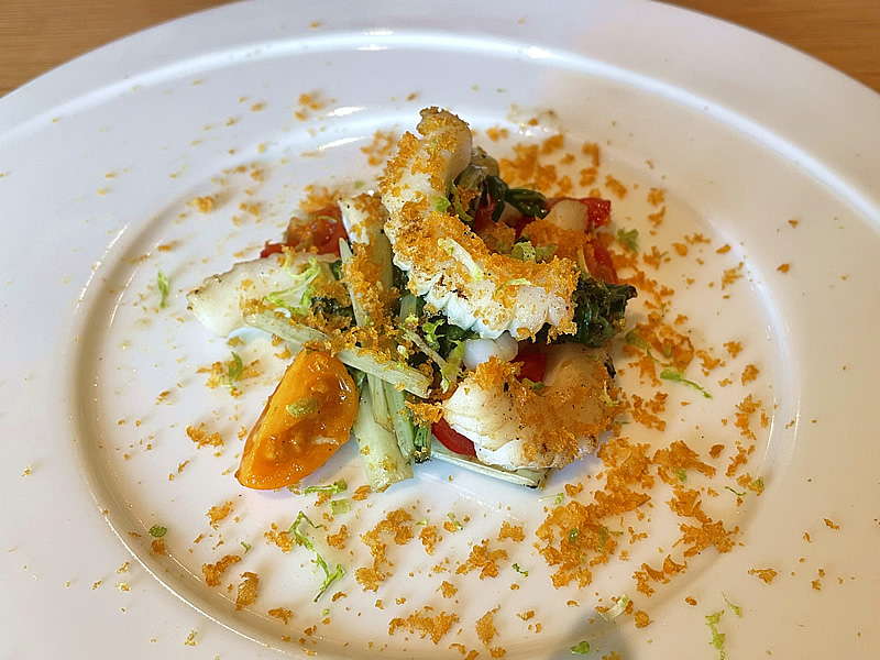 4.「アオリイカと潮江菜 カラスミとライム」。これ、キッチンからイカの焼けるいい匂いがして、出てくるのが待ち遠しかったこと!須崎産のアオリイカは旨味があります。カラスミもなんと須崎産!知りませんでしたが、宮進商店のものだそうです。ちりばめられた黄金色がキラキラしてとても綺麗です。