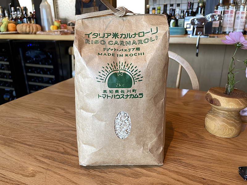 「へえ~!イタリア米を佐川で作っているの?」と不思議だったのですが、こちらが「トマトハウスナカムラ」のカルナローリ米です。水分量が日本のお米よりも少なくて乾燥した感じですが、リゾットはダシを含ませていくお料理なので、向いているのだそうです。確かに粒の形が違うし、大きい感じですね。