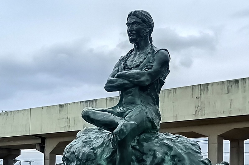 「野村長平」と言われてもわかりませんが、画面に映った銅像には見覚えがありました。以前、どっかで見たことがあるような…。もしやと思いスマホで調べると、わりと近い! 早速、写真を撮りに行ってきました。