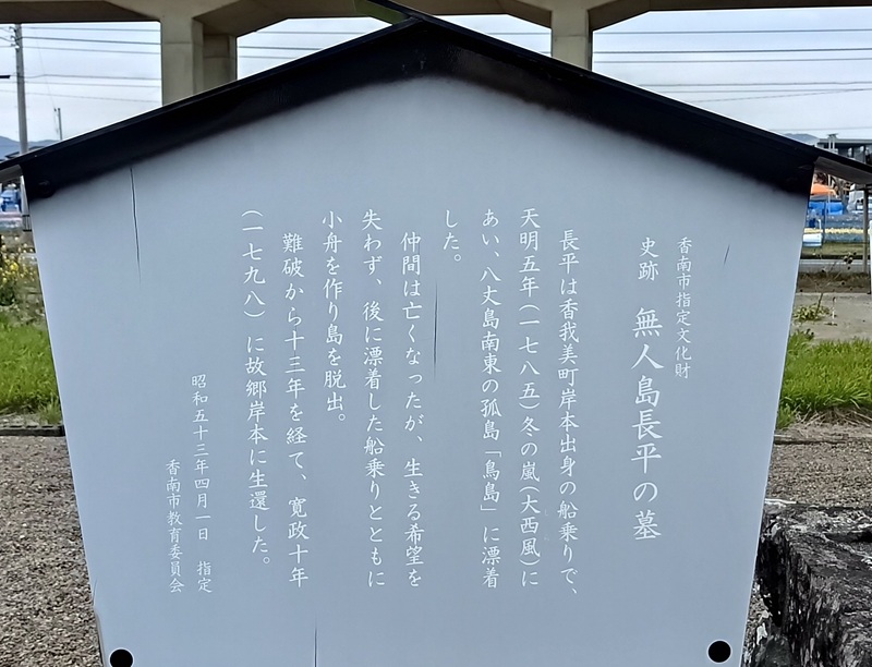野村長平さんは香南市香我美町岸本の出身。天明5年(1785年)に船で米を奈半利浦へ運んだ帰りに嵐にあい、鳥島へ漂着。当初は本人を含む仲間4人でしたが、生き残ったのは彼だけ。その後、島に新たな漂着者が現れ、その人たちと一緒に船を作り、13年ぶりに生還を果たします。地元では「無人島長平」として親しまれているようです。