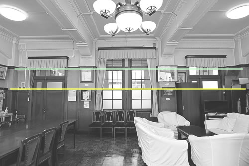 確かに!腰壁・窓枠が同じ高さで揃い、空間に一本の静かな帯をつくっています。これが『水平線の強調』なんですね。美しい。下の写真、黄色のラインです。